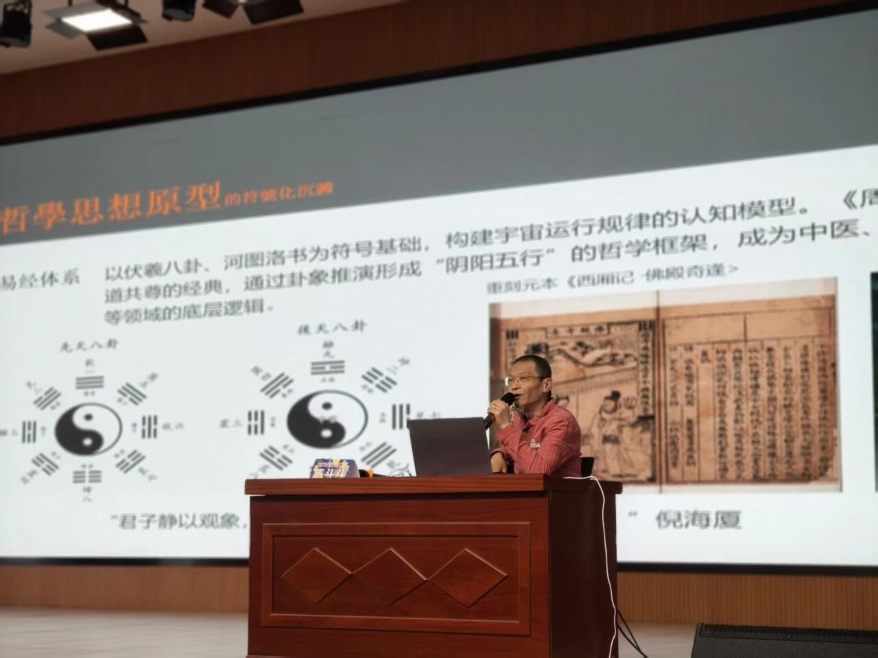 随后,陈教授围绕讲座主题展开深入讲解。在文化原型的符号化沉淀方面,他详细解读了哲学思想原型、形式原型的符号化过程,以及民俗在生活中的沉淀现象。他指出,哲学思想作为人类智慧的结晶,通过抽象概念与具体符号的结合,逐渐演变为设计中的文化密码;形式原型的符号化沉淀则体现了人类对美的规律的不断探索与总结;而民俗生活化沉淀则将日常生活中的传统习俗、文化元素融入设计,赋予作品深厚的文化底蕴。